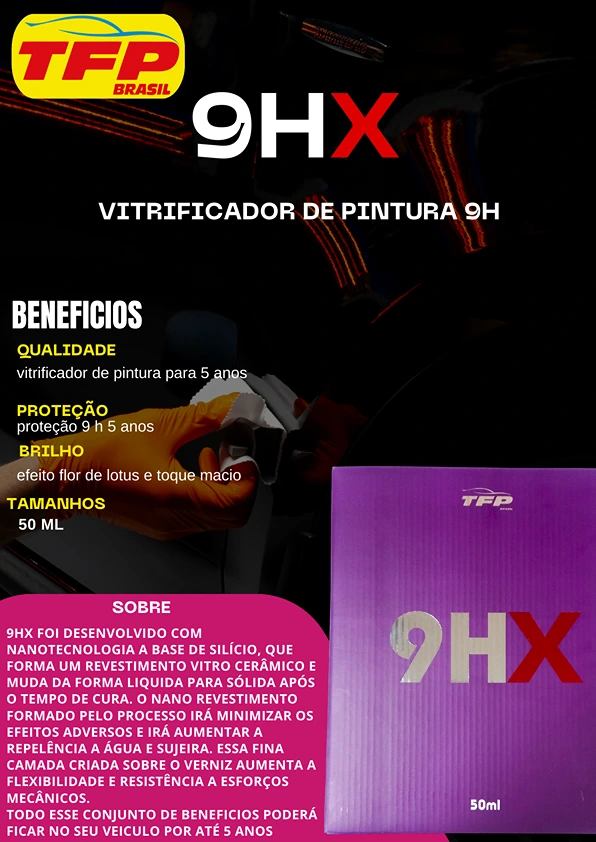 9HX foi desenvolvido com nanotecnologia a base de silício, que forma um revestimento vitro cerâmico e muda da forma liquida para sólida após o tempo de cura. O Nano revestimento formado pelo processo irá minimizar os efeitos adversos e irá aumentar a repelência a água e sujeira. Essa fina camada criada sobre o verniz aumenta a flexibilidade e resistência a esforços mecânicos.