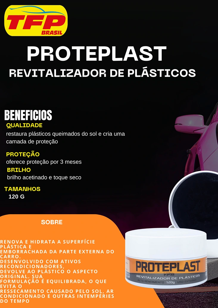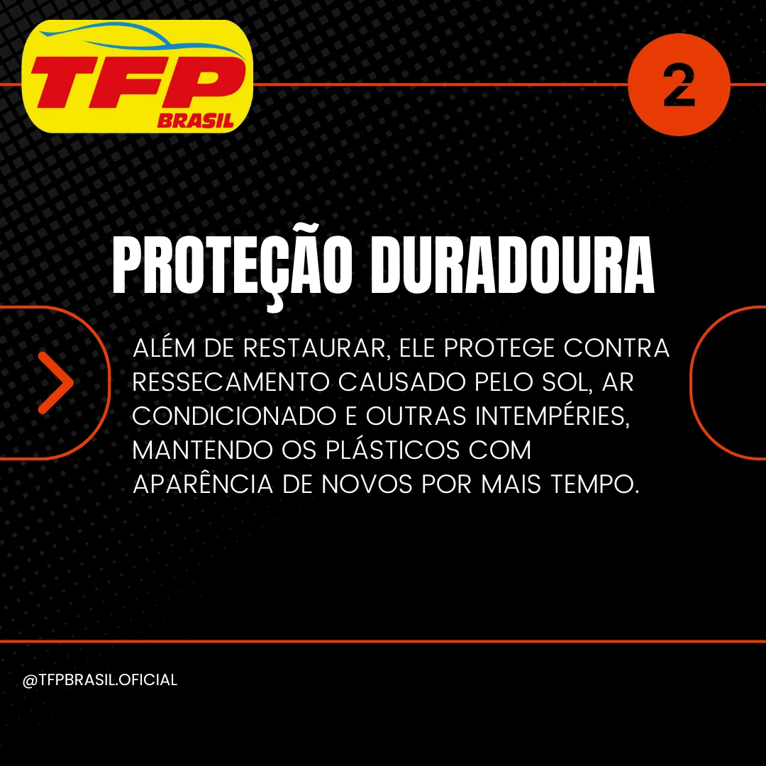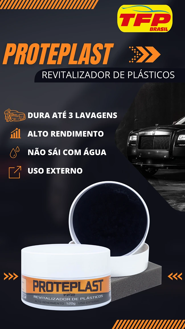 Renova e hidrata a superfície plástica e emborrachada da parte externa do carro. Desenvolvido com ativos recondicionadores, devolve ao plástico o aspecto original. Sua formulação é equilibrada, o que evita o ressecamento causado pelo sol, ar condicionado e outras intempéries do tempo.