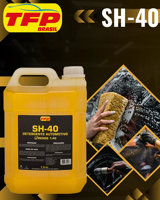 etergente neutro automotivo, com excelente rendimento e grande poder de limpeza. Indicado para limpeza externa de veículos. SH-40 remove com facilidade impurezas da pintura, resíduos de insetos nos para-brisas, grades e faróis; poeira, terra, manchas e fuligens. SH-40 limpa com perfeição sem danificar pinturas, vidros, frisos, metais e borrachas.