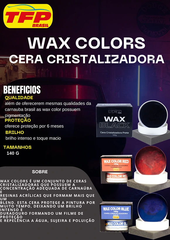Wax Black é uma cera cristalizadora que possui a concentração adequada de carnaúba e resinas acrílicas que formam mais que um blend. Esta cera protege a pintura por muito tempo, deixando um brilho intenso e duradouro formando um filme de proteção e repelência a água, sujeira e poluição.